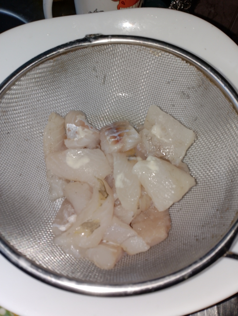 Филе рыбы нужно нарезать на удобные кусочки и приправить солью и перцем. Для усиления вкуса можно добавить немного уксуса в воду и замариновать в растворе на один-два часа. После этого рекомендуется выложить рыбу на сито, чтобы стекла лишняя жидкость.