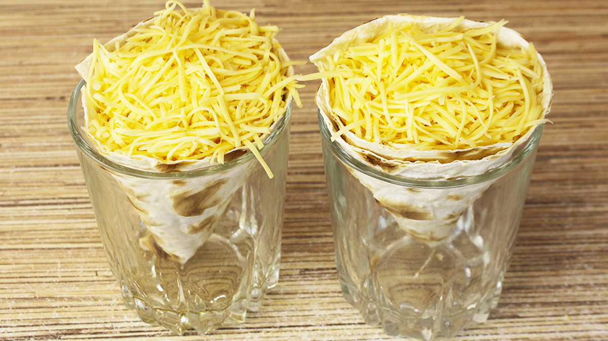 Теперь самое интересное — наполнение рожков начинкой и добавление натертого сыра на верх. Это создаст аппетитную корочку. Поместить рожки в микроволновку необходимо на одну минуту на максимальной мощности. За это время сыр расплавится, а лаваш станет хрустящим.