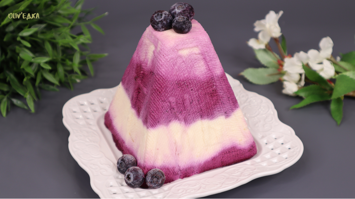 Взбейте сливки до пышной консистенции и аккуратно вмешайте в остывшую творожную массу. Разделите массу на две части: в одну добавьте черничное пюре, в другую — лимонную цедру. На дно пасочницы, застеленной марлей, уложите слоями творожные массы, чередуя их по желанию.