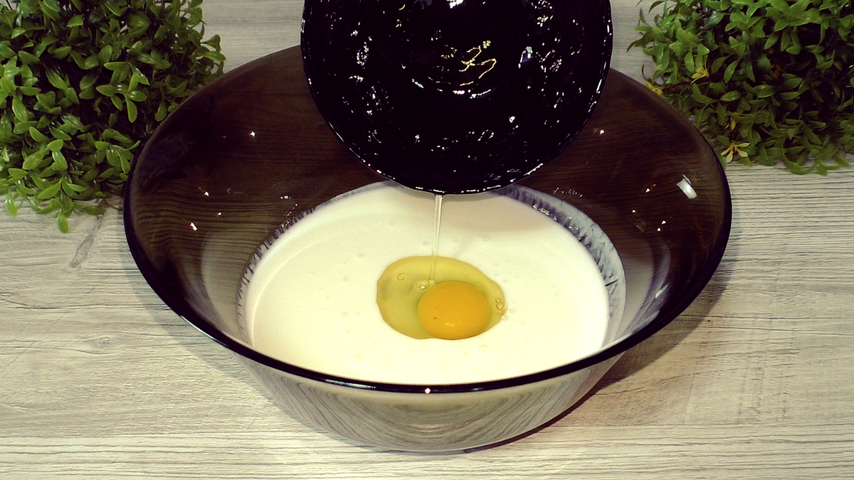 В глубокой миске с теплым кефиром добавьте яйцо, растительное масло, соль и сахар. Тщательно перемешайте массой венчиком. Затем просейте муку и добавьте её в массу, добившись консистенции, похожей на тесто для оладий. В завершение добавьте разрыхлитель и аккуратно перемешайте.
