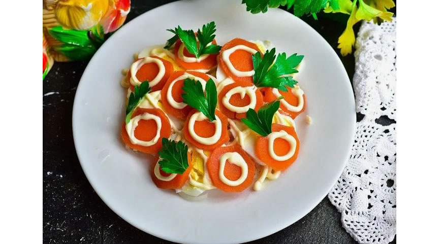 Украшение морковью: Заранее отварите морковь, остудите, очистите и нарежьте кружочками. Разложите в качестве последнего слоя.