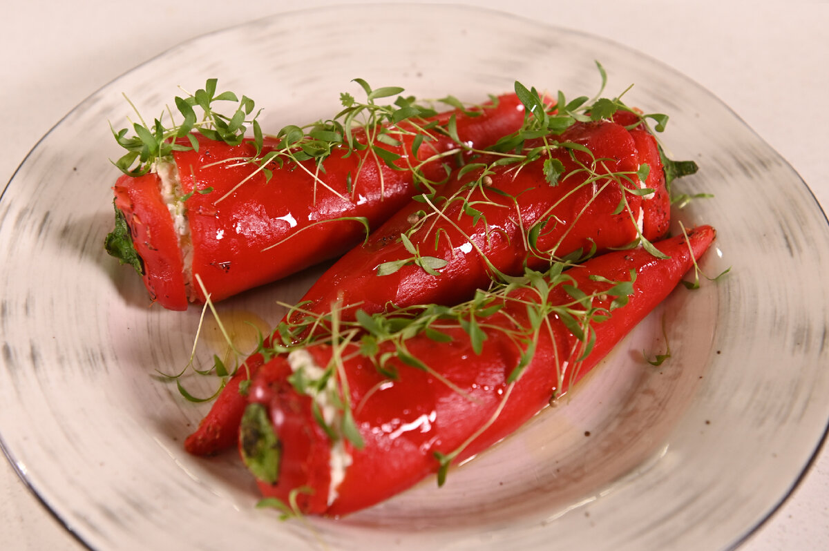 Начните с подготовки перцев: положите их на сухую сковороду и обожгите кожицу газовой горелкой, пока она не начнет лопаться.Удалите обожжённую кожицу, аккуратно подставляя перцы под струю холодной воды.Отрежьте плодоножки и уберите семена с сердцевиной. Плодоножки оставьте, они послужат крышечками для фаршированных перцев.Приготовьте начинку: в глубокой ёмкости объедините козий сыр и рикотту. Вмешайте оливковое масло, предварительно измельченные грецкие орехи, смесь перцев, немного соли и мелко нарезанную кинзу.Все тщательно перемешайте до получения однородной массы.Наполните кондитерский мешок получившейся начинкой и аккуратно нафаршируйте перцы, прикрыв их ранее отрезанными крышечками.Перед подачей полейте каждую фаршированную красоту оливковым маслом и украсьте микрозеленью. Наслаждайтесь!