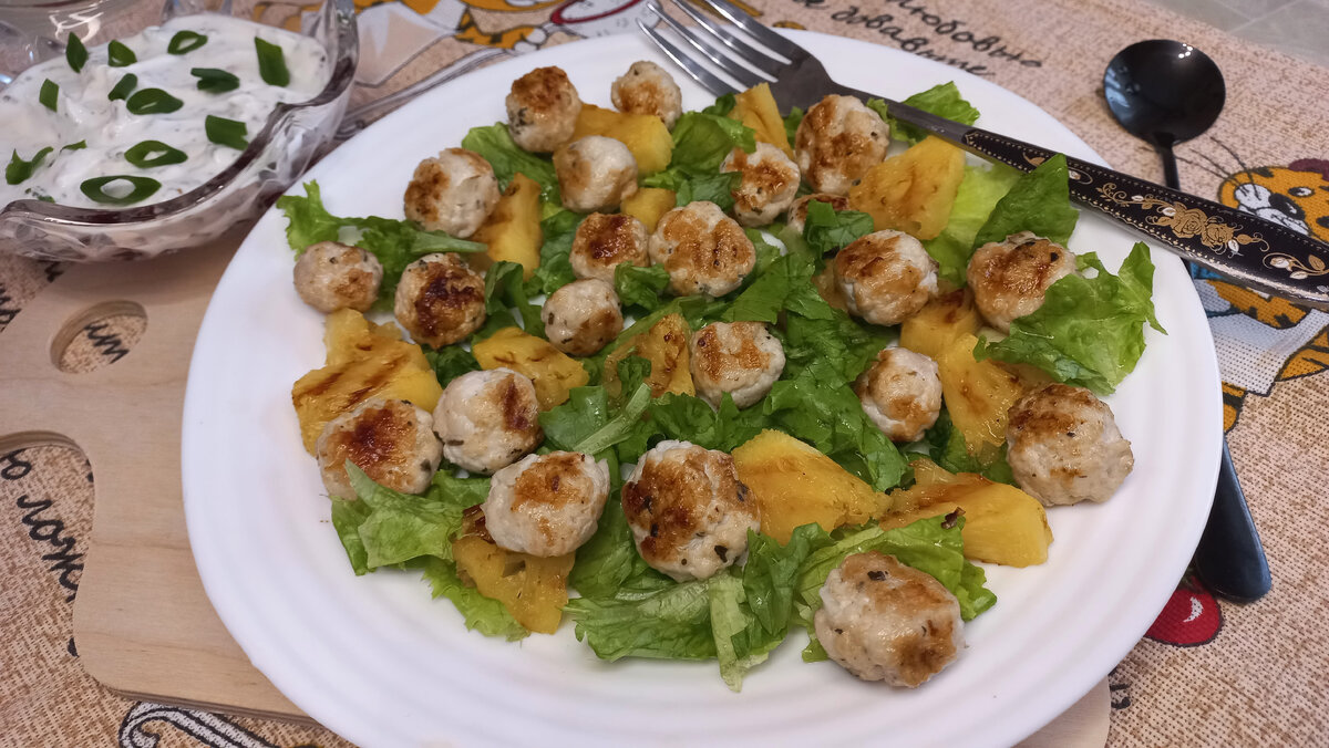 Выкладывайте на тарелку — первый слой салата, затем обжаренные фрикадельки и ананасы, и подавайте с вашим соусом. Это блюдо станет отличным дополнением к вашему весеннему меню!