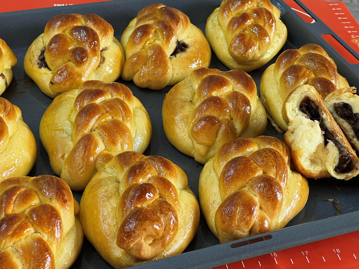 После подъема теста его следует перенести на рабочую поверхность, разделить на 12 частей и сформировать из них колобки. Каждый шарик раскатывают в овалы, выкладывают начинку и формируют булочки по желанию. Заготовленные булочки укладывают на противень, смазывают желтком и оставляют на расстойку еще на 20 минут.