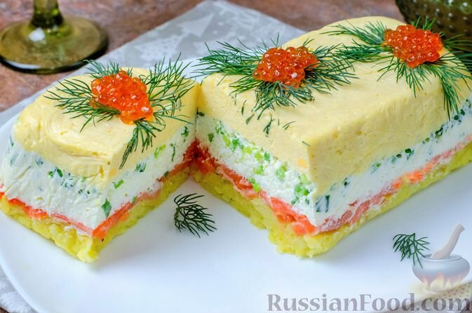 - Салат-торт с красной рыбой - этот нарядный салат с картофелем, сыром и яйцами не только приятно удивит, но и станет украшением вашего стола. Его структура позволяет держать форму, делая его похожим на настоящий торт, а добавление желатина в майонез придаёт ему особую устойчивость.