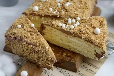 - Крем: 300 г сахара, 400 г сливочного масла, 250 мл молока, 4 яичных желтка, 1 ст. л. коньяка и щепотка ванилина