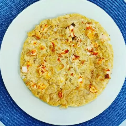Репчатый лук и рыбу нарежьте мелким кубиком и обжарьте на сковороде с растительным маслом до золотистой корочки. Затем вылейте сверху тесто для блинов, дайте ему подрумяниться, аккуратно переверните и дожарьте с другой стороны. Так ваш завтрак получится аппетитным и румяным!