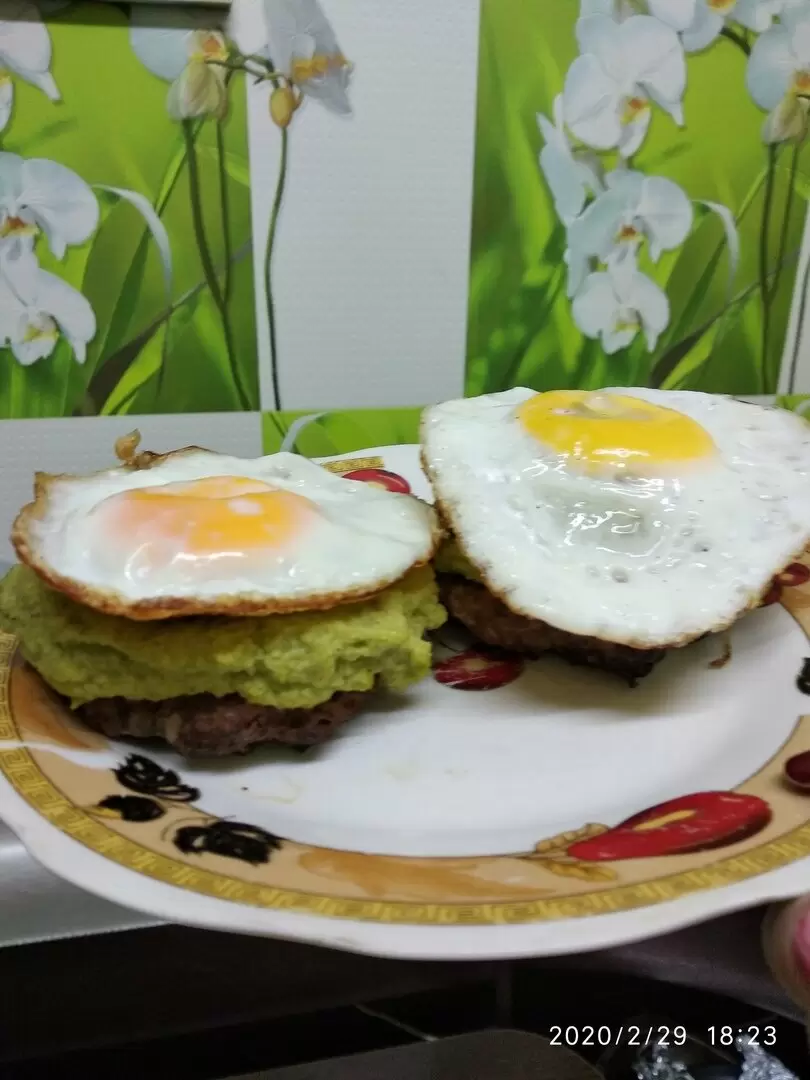 Сборка бургера: на готовую котлету положите гуакамоле, сверху аккуратно разместите жареное яйцо. Для финального штриха сервируйте бургер на листе свежего салата.