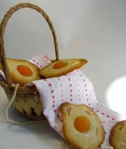 Теперь следует выдавливать небольшие порции теста на заранее подготовленный противень, в центр каждой порции устанавливая половинку абрикоса (предварительно обсушенную на бумажном полотенце). Затем противень помещается в предварительно разогретую до 180 градусов духовку на 15-20 минут до появления легкого золотистого оттенка.