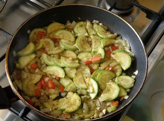 3. Затем добавьте цукини, аккуратно перемешивая. Введите специи по вкусу, мелко порубленный укроп и немного уксуса для легкой кислинки.