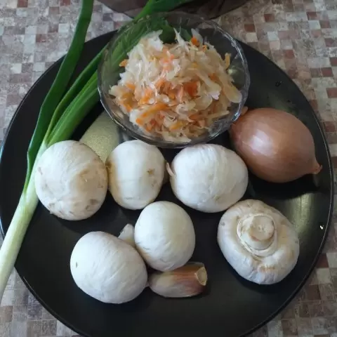 Красиво обжаренные лук и грибы измельчаются в мясорубке или блендере. Квашеную капусту также стоит немного нарезать и обжарить на той же сковороде около 2-3 минут. Затем все ингредиенты соединяются с фаршем, добавляется яйцо, нарезанный зеленый лук, соль и перец. Получившуюся массу нужно тщательно перемешать и оставить на полчаса для настаивания.