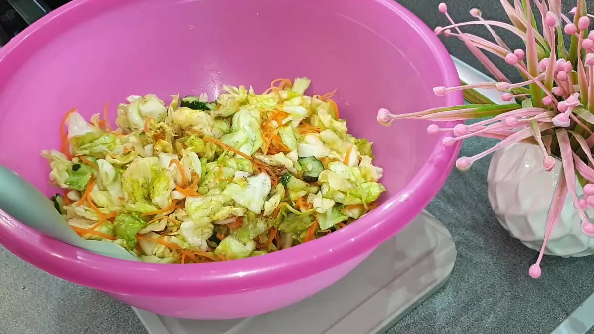 Капусту нарезать кусочками, огурец — мелкими дольками, а морковь — натереть на терке. Все овощи помещаются в глубокую миску, добавляется соль и тщательно перемешивается. Такой процесс помогает овощам выделить сок.