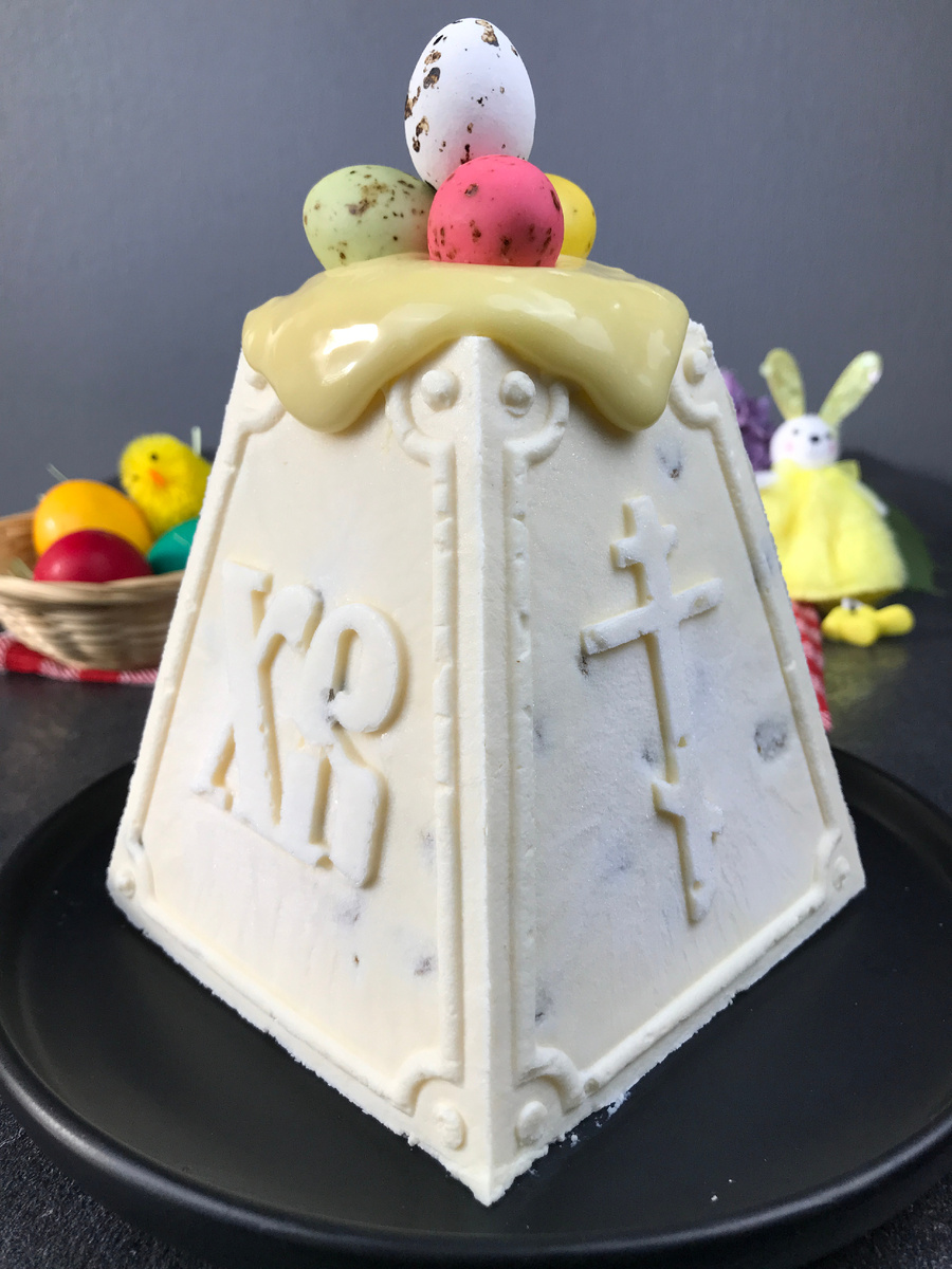 После того как масса замерзнет, её можно извлечь из формы и дать немного оттаять в холодильнике в течение 3-4 часов. Затем белоснежную пасху можно украсить по желанию и подавать.