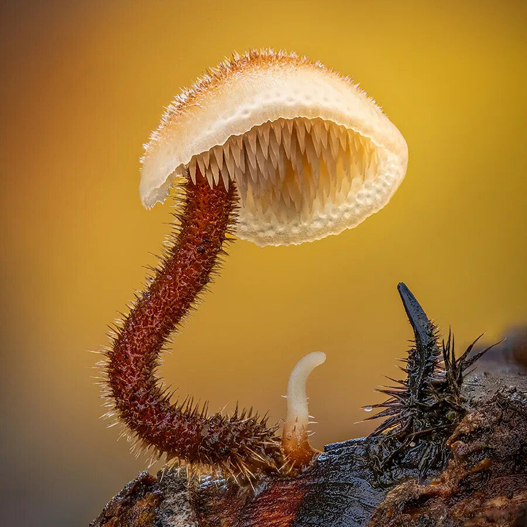 Обнаружив на старой сосновой шишке этот крошечный гриб с игольчатой основой, стоит остановиться и поразмышлять — даже в мире, полном заметных обитателей леса, есть свои незаметные герои, без которых экосистема потеряла бы гармонию.