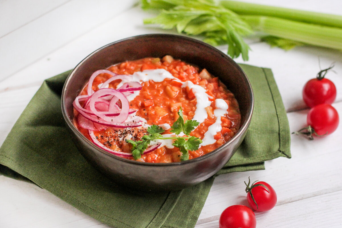 Шаг 2: Теперь пришло время объединить все ингредиенты. К овощам добавить протертые томаты, индийский соус, чечевицу и кокосовое молоко. Оставьте немного кокосового молока для украшения. Приправьте блюдо солью и перцем, тщательно перемешайте. Уменьшите огонь, накройте крышкой и тушите около 7 минут. Подавайте расам, украсив раскрашенным кокосовым молоком и маринованным красным луком.