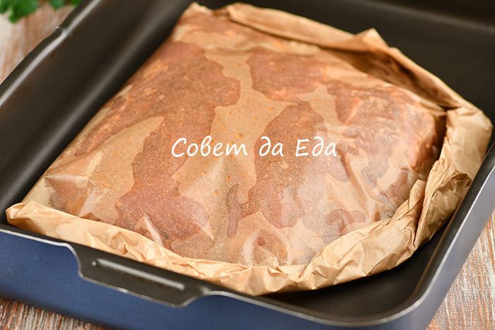 Выбор свежей свиной лопатки весом около 1 кг станет залогом успеха. Соль, сушеный чеснок и специи равномерно распределяются по мясу. Пергамент складывается пополам, и мясо помещается в форму. Затем его опять закрывают пергаментом и отправляют в разогретую духовку на 1 час.
