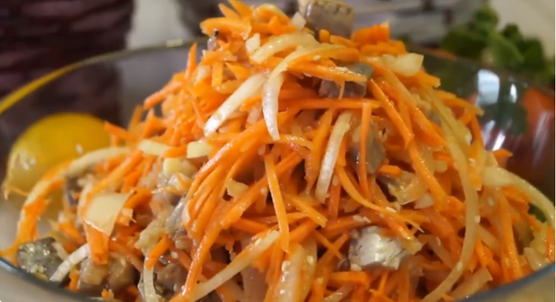 После завершения маринования, сельдь следует откинуть на дуршлаг, чтобы стек уксус. После этого в миску добавляют морковь, лук, соль, измельченный чеснок, соевый соус, растительное масло и семена кунжута. Все ингредиенты тщательно перемешиваются и помещаются в холодильник на 2 часа для настаивания.