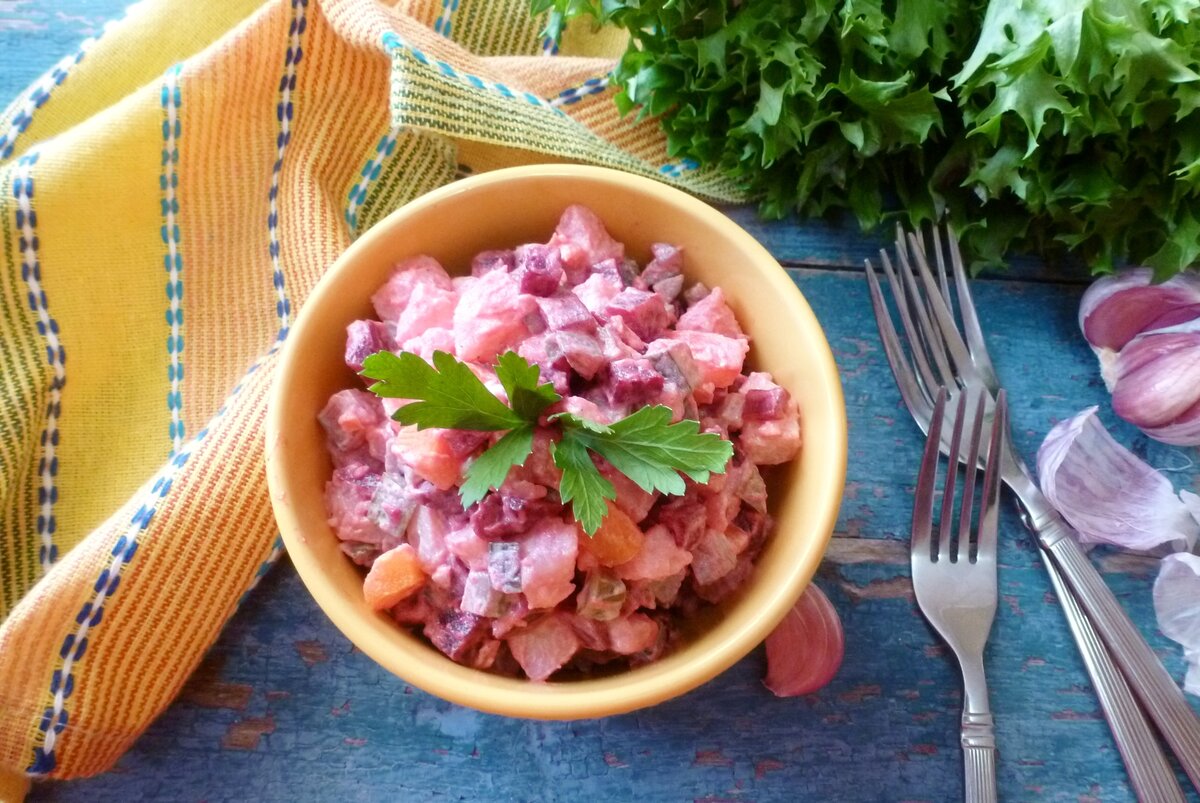 Многие могут заметить, что этот салат напоминает привычный винегрет, однако на самом деле он совершенно уникален. Главный «хит» — добавление чеснока и заправка майонезом, что придает блюду интересный и сытный вкус. Нет сомнений, он оставит приятное послевкусие и удивит своей самобытностью.