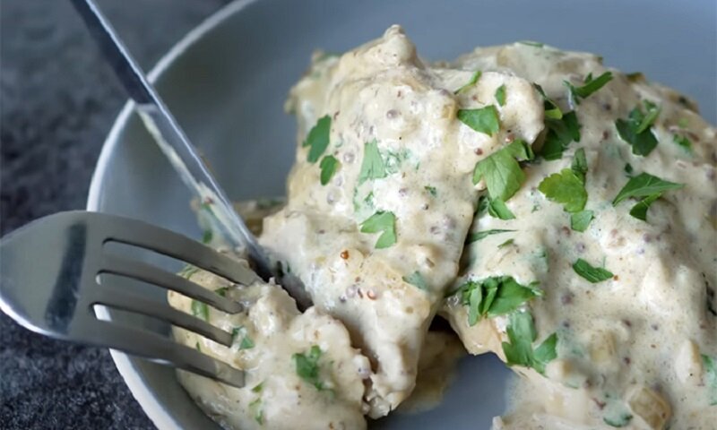Готовое блюдо посыпать нарезанной зеленью петрушки и подать на стол вместе с соусом, в котором оно готовилось. В качестве гарнира отлично подойдут свежие овощи, лепёшки или белый хлеб.