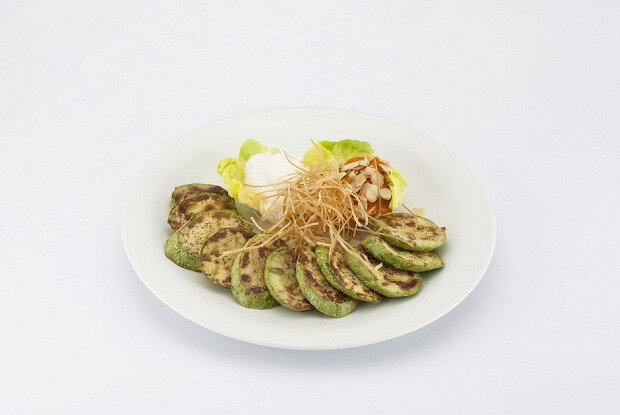 Начните с приготовления кабачковой икры — она станет вашим соусом. Нарежьте лук, морковь, 50 г кабачков и болгарский перец мелкими кубиками. Обжарьте на растительном масле до полуготовности.Добавьте томаты и готовьте еще 2-3 минуты, затем влейте 200 мл воды и продолжайте варить до мягкости овощей. Снимите с огня, поперчите и посолите. Дайте остыть, а затем измельчите блендером до однородного состояния. Уберите в холодильник до подачи.Остальные кабачки нарежьте тонкими овальными ломтиками. Обваляйте их в пшеничной муке, разогрейте топленое масло на сковороде и обжаривайте ломтики до золотистой корочки с обеих сторон.На тарелке выложите ломтики кабачков веером. На одной стороне положите два листа латука, на одном из них сметану, а на другом — кабачковую икру. Посыпьте миндальными хлопьями и подавайте к столу.Этот рецепт превратит любое застолье в настоящий праздник вкуса. Приятного аппетита!