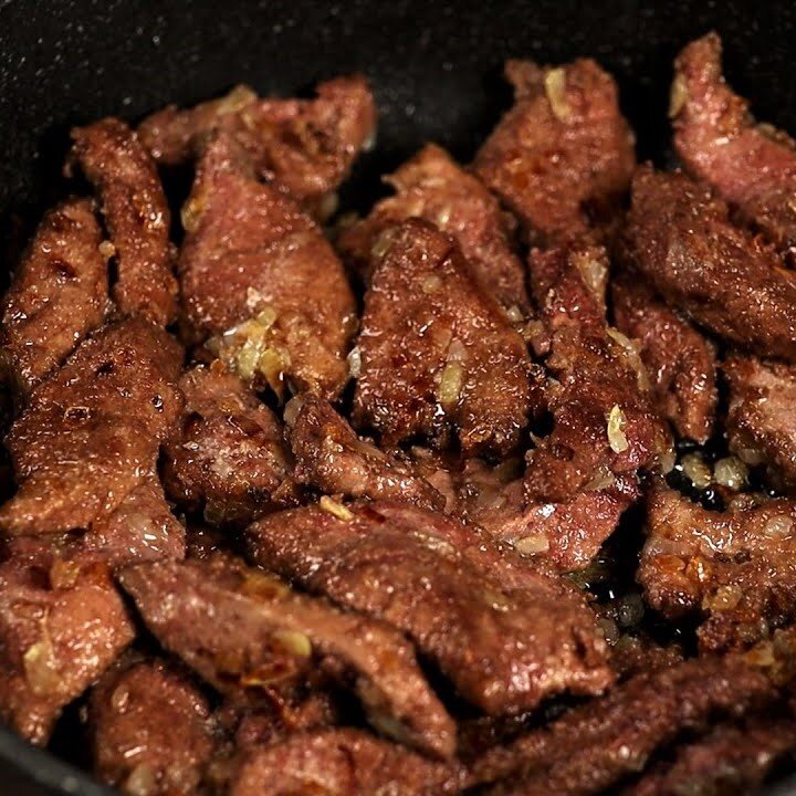 В это время лук нарезается мелко и отправляется на раскалённую сковороду с растительным маслом. Лук поджаривается на среднем огне до золотистого цвета. Когда лук готов, добавляется печень, которую обжаривают на сильном огне до образования румяной корочки.