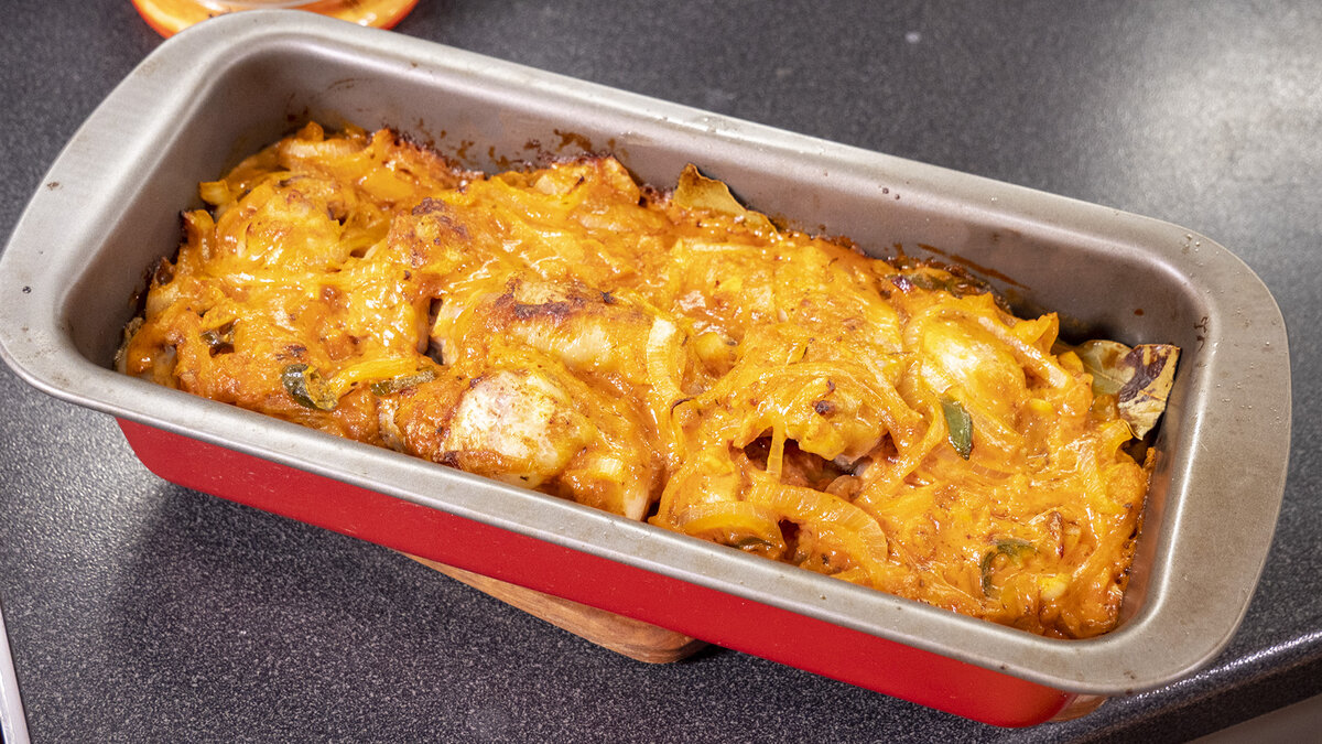 Пока мясо обжаривается, нарежьте одну луковицу полукольцами, а половину чили порежьте кольцами. Когда курица приобретет золотистую корочку, переместите ее в форму для запекания, а лук и чили подрумяньте на той же сковороде.