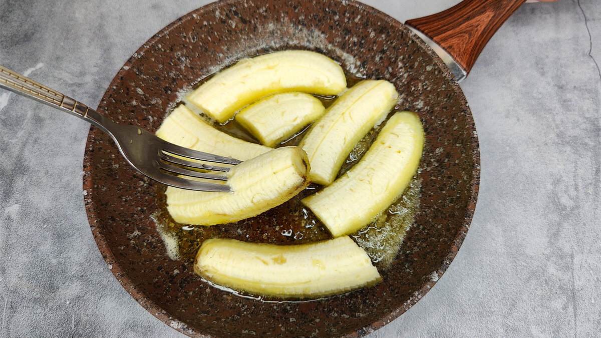 Положите подготовленные бананы в сковороду. В отдельной миске взбейте яйцо, добавьте молоко, сахар и какао. Хорошо перемешайте.