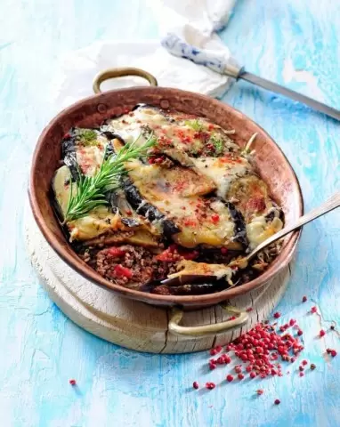 5. Теперь начните сборку: уложите слой мясного фарша, затем баклажаны и залейте бешамелью. На завершающем этапе присыпьте натёртым сыром и приправьте.