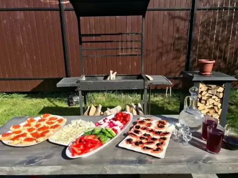Праздничный стол был накрыт в доме, но вскоре вся компания перебралась к мангалу, чтобы пожарить куриные крылышки. На столе присутствовали:
