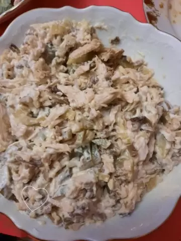 Отварное куриное мясо рекомендуется разобрать на волокна, что придаст салату текстуру. Затем все ингредиенты соединяются в одной емкости, создавая гармоничную смесь.