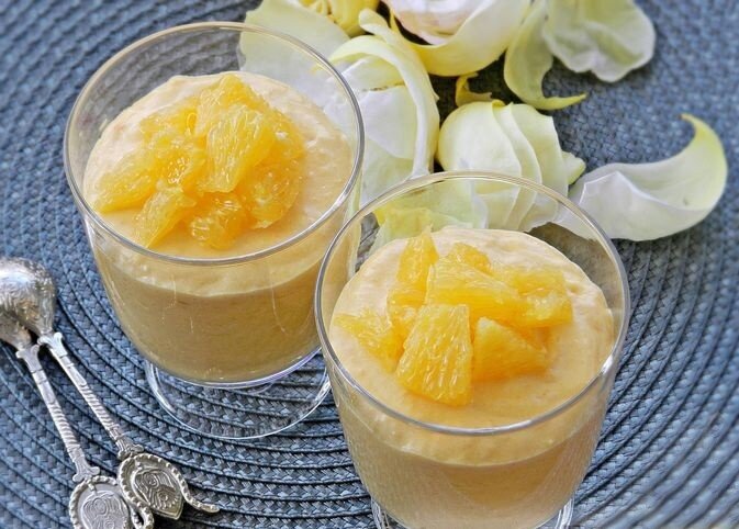 9. Дольки убрать от пленок и нарезать. Перед подачей украсить готовый десерт кусочками апельсина.