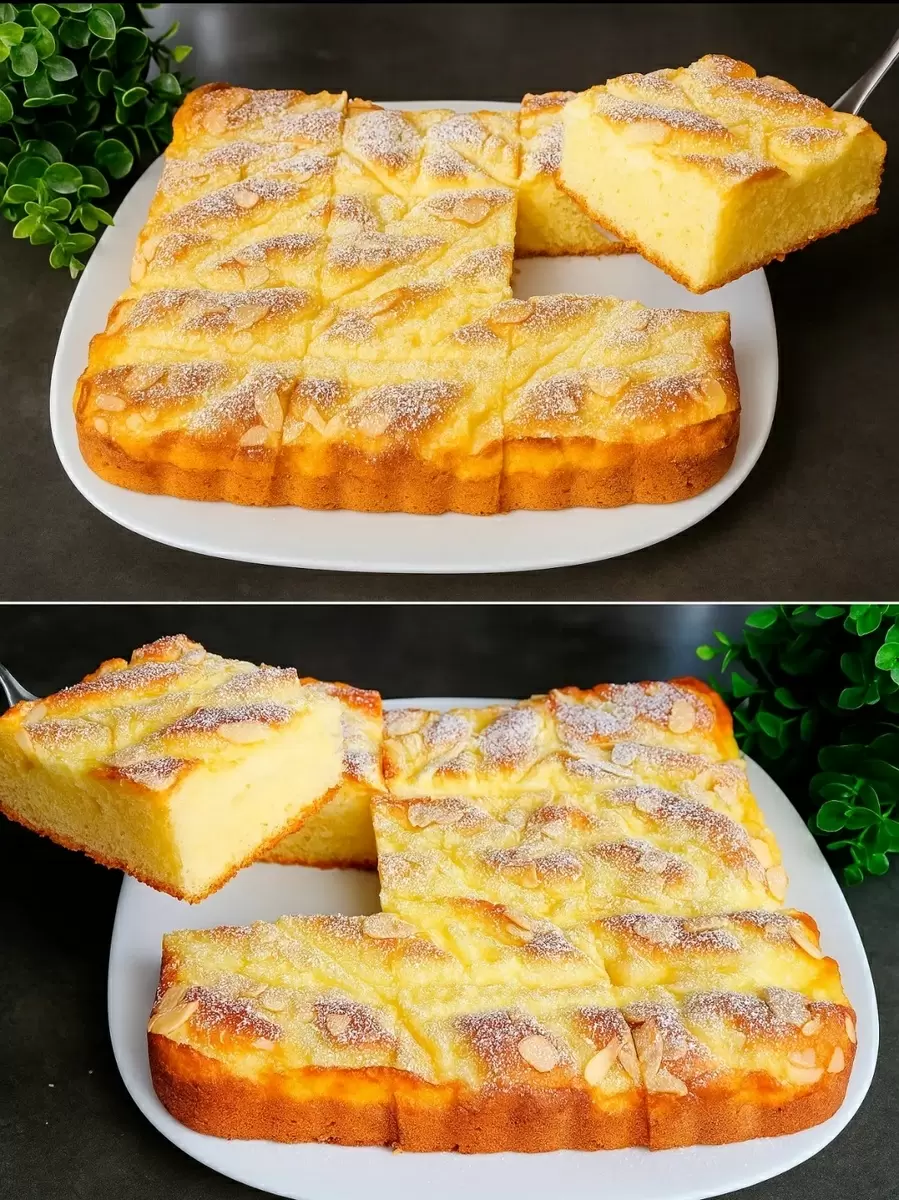 Затем вылейте тесто в подготовленную форму и разровняйте его. Для удобства крем можно переложить в кондитерский мешок и равномерно распределить по тесту. Если хочется, добавьте сверху миндальные лепестки для дополнительного хруста и аромата!