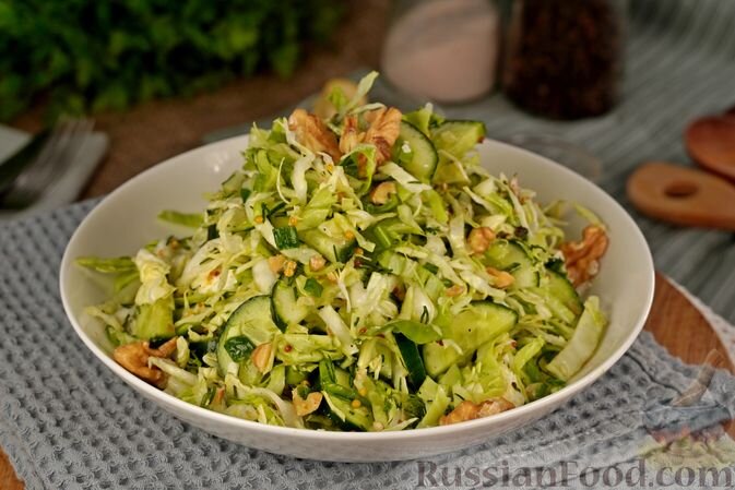 Этот лёгкий салат, в котором свежая капуста гармонирует с огурцами и фетой, станет настоящим хитом среди легких закусок. Добавление грецких орехов придаст текстуру и нежный ореховый вкус.
