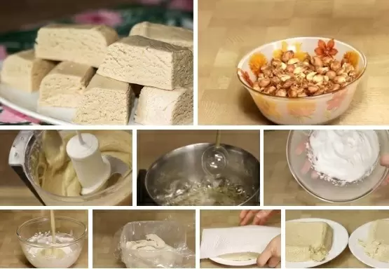 7. Для удобства можно использовать ёмкость, застелил её пленкой или пергаментом, куда выкладывают получившуюся массу. Халва должна остыть и устанавливаться в прохладном месте.