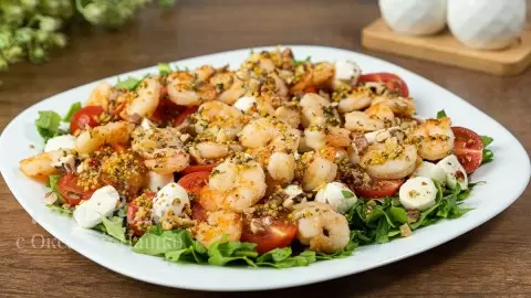 Шаг 4: Сложите все компоненты на блюдо: начните с рукколы, затем добавьте помидоры и моцареллу, завершая креветками. Полейте заправкой и посыпьте жареными орехами. Ваш вкусный салат готов к подаче!