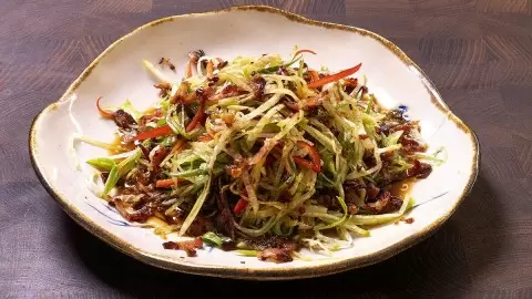 Чтобы сделать этот салат, сначала нарежьте редьку, зеленый лук и перец чили очень тонкой соломкой и тщательно перемешайте все ингредиенты. По желанию, нарезанные овощи можно на несколько минут поместить в холодную воду, чтобы уменьшить их остроту. Затем выложите на бумажное полотенце, чтобы избавиться от излишков влаги.