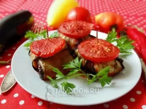 - Приготовьте баклажаны: Нарежьте баклажаны полосками, посолите и оставьте на 15 минут. Обжарьте их на сковороде с маслом до мягкости и затем промокните излишки масла бумажным полотенцем. Уложите две полоски баклажанов перекрестно, в центр положите котлету, заверните края, сверху добавьте кружок помидора и скрепите конструкцию зубочисткой.