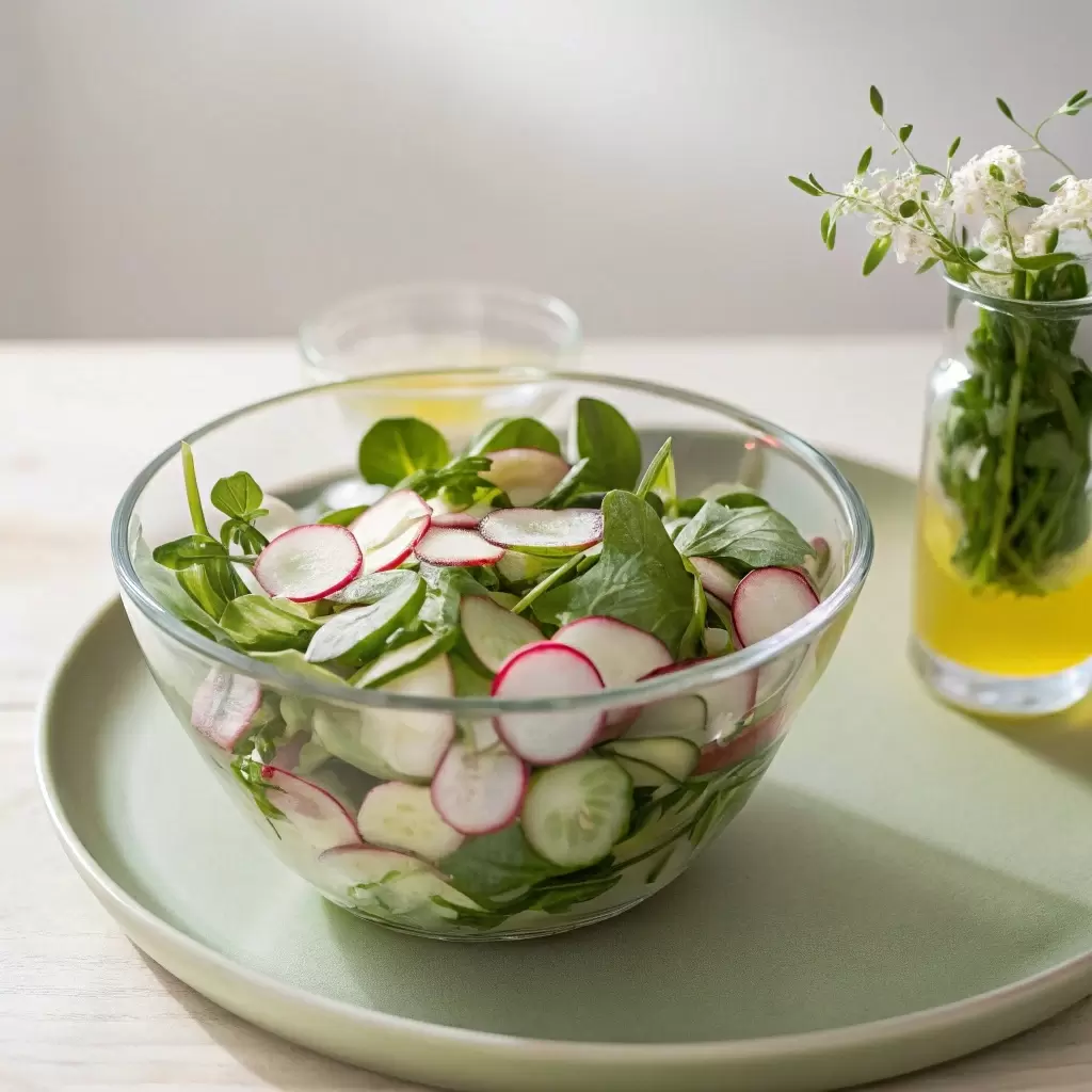 Давайте начнем с яркого и насыщенного витаминами зеленого салата. Это простое, но очень полезное блюдо связано с детоксикацией. В нем утопает свежесть редиса и огурца, а добавление зелени создает гармоничное сочетание.