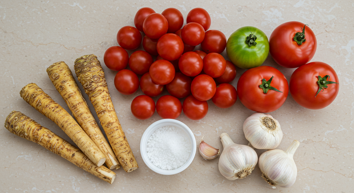 - Корень хрена (250 г): Свежий и крепкий корень добавит характерный вкус и аромат, но приготовьтесь к небольшим слезам во время чистки.