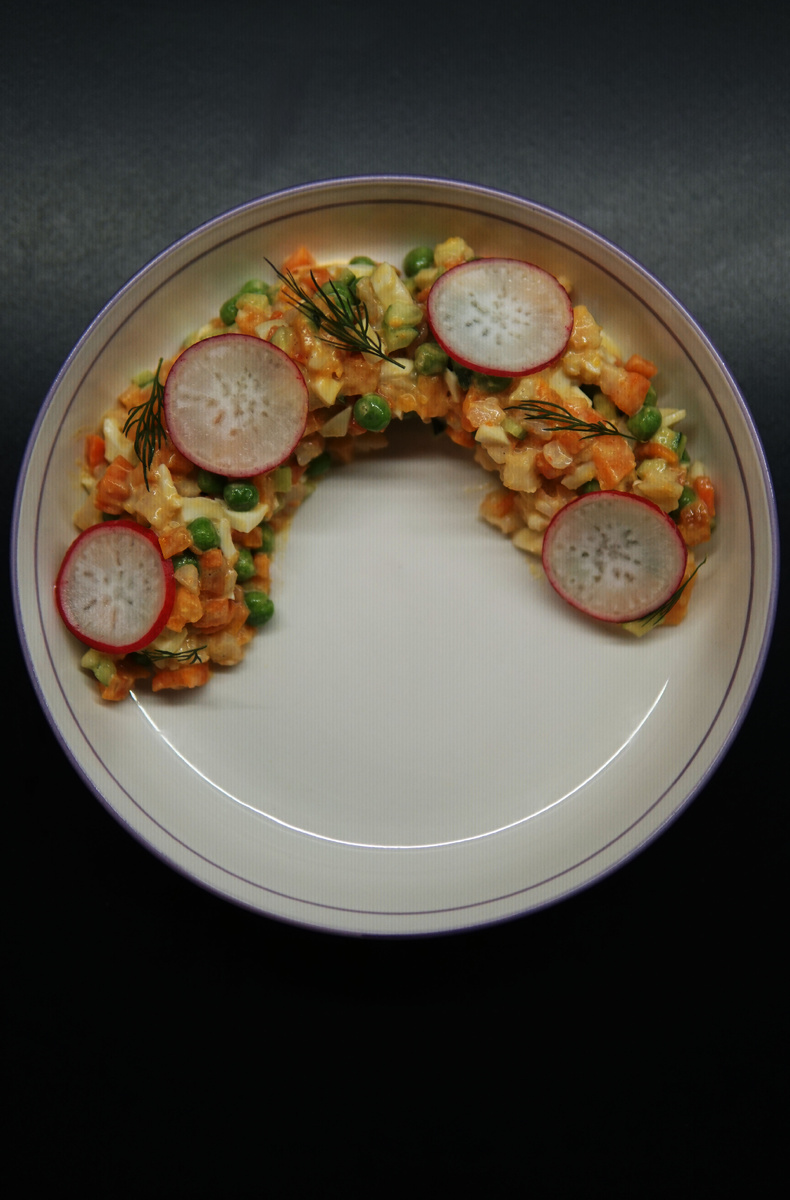 Основу выбираем с вниманием к текстуре: батат вместо картофеля, запечённый до мягкости, делает салат более нежным и тёплым. Морковь и огурец в умеренных порциях добавляют свежесть, а зелёный горошек сохраняет яркость оттенков.
